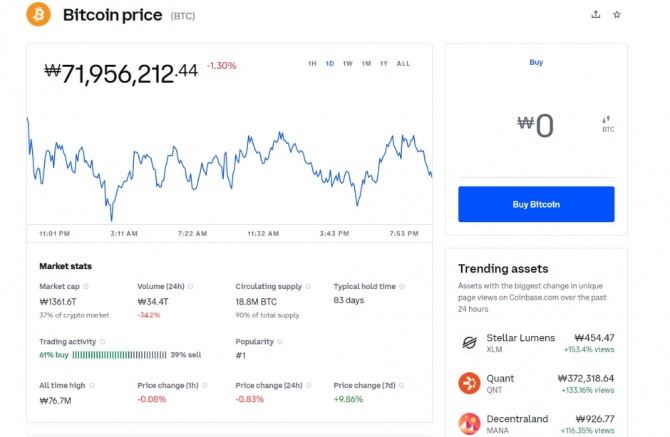 비트코인은 이시각 하락세다. 전일 급등에 따른 조정으로 보인다. 전 세계 ETF 시장 규모는 6조7000억 달러에 이르는 것으로 추산된다. 비트코인으로서는 6조7000억 달러에 이르는 새로운 시장을 확보하는 것이다. 한국거래소에 따르면 비트코인 호환으로 비덴트, 우리기술투자 등이 상승탄력을 받고 있다. 우리기술투자는 가상자산 거래소 업비트를 운영하는 두나무의 지분을 보유하고 있다. 두나무에 투자하고 있는 한화투자증권도 주목받고 있다.