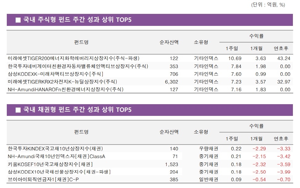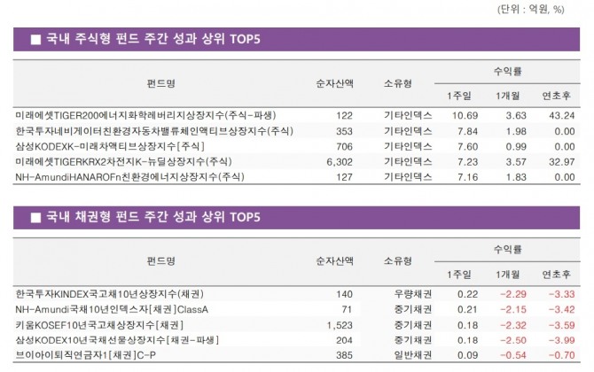 국내 주식형 펀드의 성과를 살펴보면 순자산액(클래스 합산) 100억 원 이상, 운용기간 1개월 이상인 펀드 3676개 중 2214개가 최근 한 주간 플러스 수익률을 기록했다. 코스피지수 등락률을 상회한 펀드는 1068개다. '미래에셋TIGER200에너지화학레버리지상장지수(주식-파생)'펀드가 10.69%의 수익률로 국내 주식형 펀드 중 최고 성과를 기록했다.