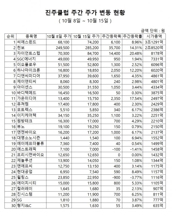 '진주클럽' 전체 시가총액은 지난 8일 기준 12조6135억 원에서 한주간1조200억 원(8.1%) 상승해 15일 현재 13조6335억 원을 기록했다.