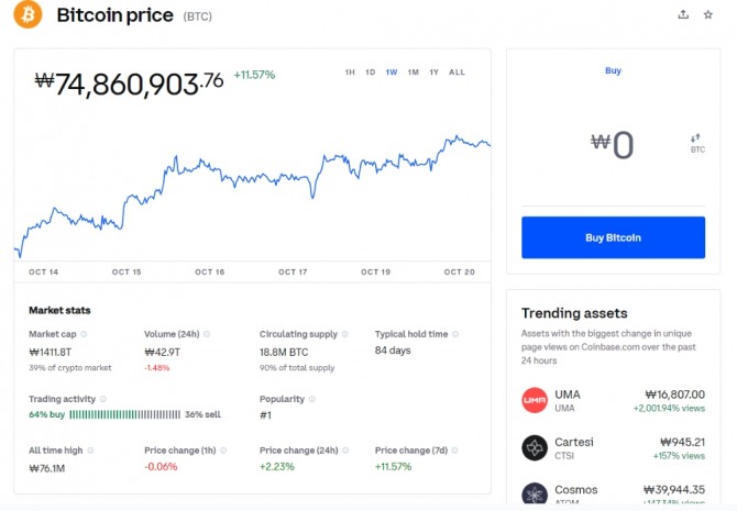 가상화폐 암호화폐 비트코인 선물을 기반으로 한 상장지수펀드(ETF)가 미국 증시에서 첫 거래를 성공적으로 마무리했다. 알트코인을 비롯한 전체 가상화폐 시장에는 별 다른 영향을 주지 않고 있다. 뉴욕증권거래소(NYSE)에서 자산관리업체 프로셰어스의 비트코인 선물 ETF ‘프로셰어스 비트코인 전략 ETF’(BITO)는 4.85%(1.94달러) 상승한 41.94달러(약 4만9231원)에 장을 마감했다. 시초가 40.88달러로 거래를 시작한 프로셰어스의 ETF는 장중 한때 5.4% 상승한 42.15달러를 찍기도 했다. BITO는 시카고상품거래소(CME)에서 거래되는 비트코인 선물을 추종하기 때문에 그 자체로는 비트코인 시세엔 직접적 영향을 주지 않는다. 다만 비트코인 선물 ETF의 흥행 성공이 비트코인에 대한 관심도를 끌어올린 것으로 추정된다.