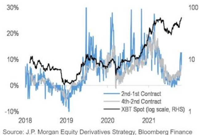 전략가에 따르면 2019년 중반 이후로 두 번째와 첫 번째 비트코인 선물 사이의 롤 다운에 대한 평균 연간 비용은 약 9%였다. 네 번째와 두 번째 선물 사이는 약 8%였다. 이는 JP모건에 따르면 비트코인 선물 기반 ETF의 캐리 비용이 이미 제품 관리 수수료보다 몇 배 더 클 수 있음을 의미한다. BITO의 경우 사업비율은 0.95%다.