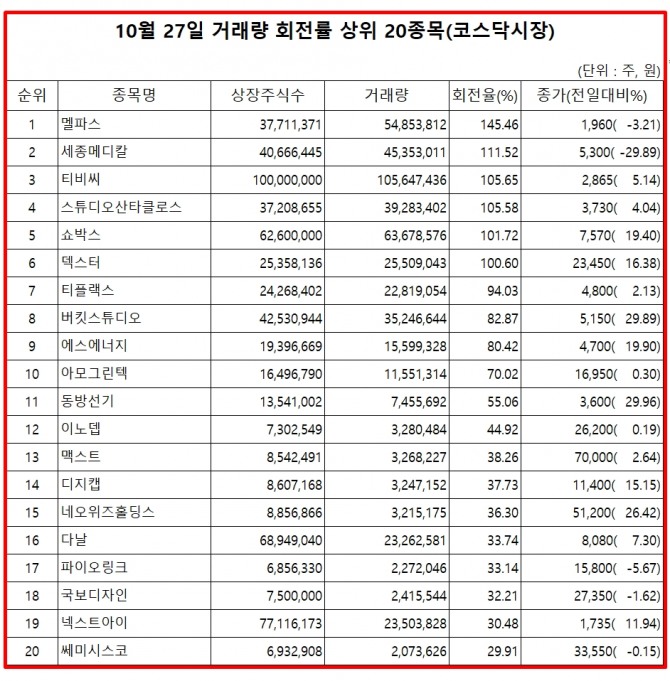 27일 주식시장에서 코스닥 시장 거래량 회전율 상위 종목은 다음과 같다.