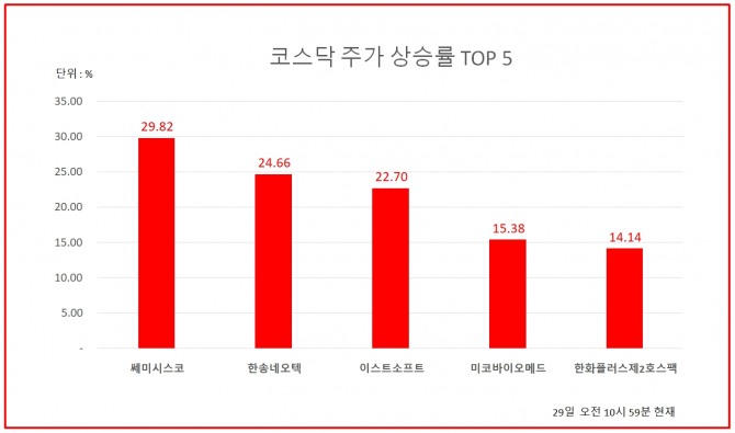 29일 오전 10시 59분 현재 코스닥 상승률 상위 50개 종목은 다음과 같다.