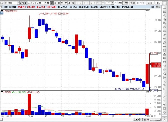 진원생명과학은 지난 10월 한달간 주가가 26.97% 하락하며 부진했으나, 11월 첫 거래일 20% 넘는 상승률을 기록하며 지난달 부진을 상당부분 만회했다.