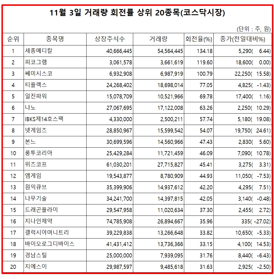 3일 주식시장에서 코스닥 종목의 거래량 회전율 기준 상위 종목은 다음과 같다.