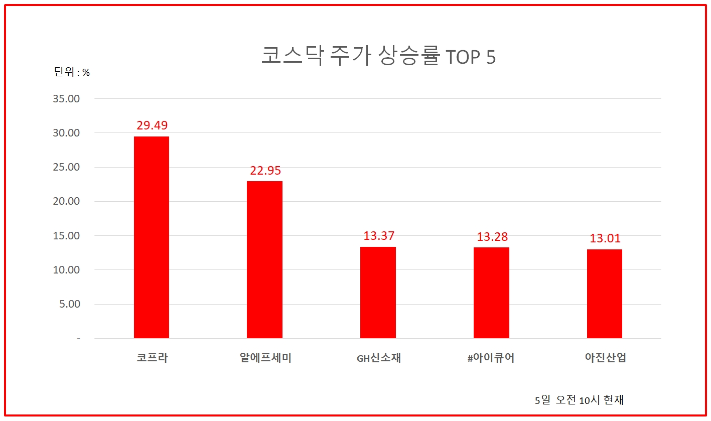 뒤를 이어 알에프세미, GH신소재 등도 상승률 상위권에 이름을 올리고 있다.
