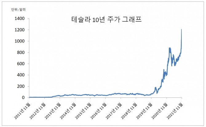 과서 테슬라의 지난 10년간의 테슬라 주가 데이터를 살펴보니, 지난 2011년 11월 2일 테슬라 주가는 5.742달러를 기록하고 있었다.