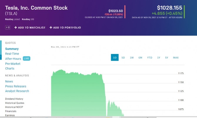 뉴욕증시에서는 최고경영자(CEO) 일론 머스크가 대규모 주식 매도 의향을 내비친 뒤 전기차 업체 테슬라의 주가가 큰 폭으로 하락했다. 테슬라의 주가는 이날 11.99% 하락하면서 이틀 연속으로 하락세를 이어갔다. 전날 5% 가까이 급락했던 테슬라 주가는 이날 낙폭이 더 커졌다. 올해 들어 가장 큰 낙폭이다. 한때 '천이백슬라'까지 올라갔던 이 회사 주가는 '천슬라'로 주저앉았다.