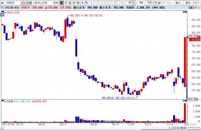 11일 오후 2시 46분 현재 엔씨소프트 주가는 전거래일보다 29.75%(18만 원) 오른 78만5000원에 거래되고 있다.