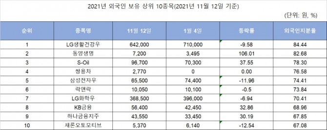 반면, 외국인 지분율 상위 10종목 중 2, 3위와 8, 9위를 기록한 동양생명과 S-Oil, KB금융과 하나금융지주 4종목 만큼은 올해 주가가 상승했다.