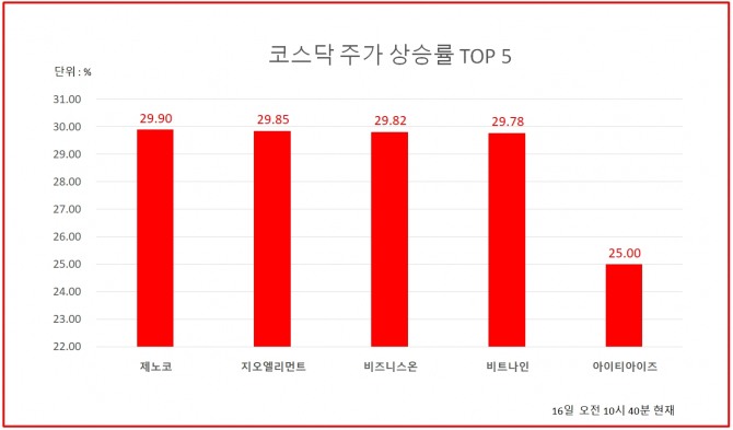 16일 오전 10시 40분 현재 코스닥 상승률 상위 50개 종목은 다음과 같다.