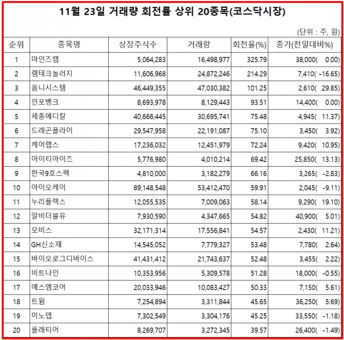 23일 주식시장에서 코스닥 종목의 거래량 회전율 기준 상위 종목은 다음과 같다.