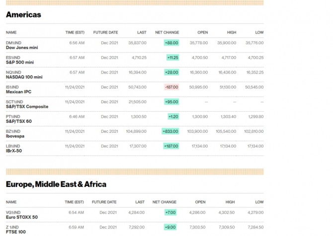 24일 아침에 끝난 뉴욕증시는 연방공개시장위원회(FOMC) 의사록이 공개되고 인플레이션 우려가 커졌음에도 국채금리가 하락세를 보이면서 혼조 마감했다. 뉴욕 증권거래소(NYSE)에서 다우존스30산업평균지수는 전장보다 9.42포인트(0.03%) 하락한 35,804.38을 기록했다. 스탠더드앤드푸어스(S&P)500지수는 전장보다 10.76포인트(0.23%) 오른 4,701.46을 나타냈고, 기술주 중심의 나스닥 지수는 전장보다 70.09포인트(0.44%) 오른 15,845.23으로 거래를 마감했다. 추수감사절 연휴를 앞두고 투자자들은 11월 FOMC 의사록과 연방준비제도(연준·Fed)가 선호하는 물가 지표 등 주요 경제 지표 발표를 주시했다.