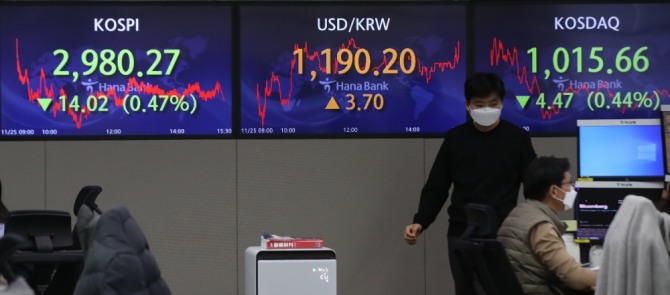 코스피가 전 거래일(2996.74)보다 14.02포인트(0.47%) 내린 2980.27에 장을 마감한 25일 오후 서울 중구 하나은행 딜링룸에 지수가 표시되고 있다. 사진=뉴시스이미지 확대보기