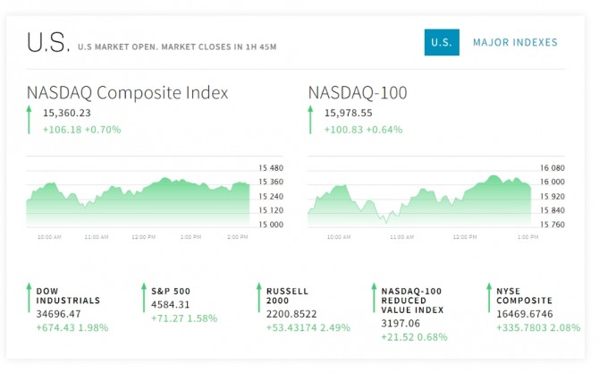 이미지 확대보기3일 뉴욕증시에 따르면 뉴욕증권거래소(NYSE)에서 다우존스30산업평균지수와 스탠더드앤드푸어스(S&P)500지수 그리고 기술주 중심의 나스닥 지수 모두 오르고 있다. 이날 뉴욕증시에서는 투자자들은 신종 코로나바이러스감염증(코로나19) 변이종인 오미크론 관련 뉴스와 인플레이션 우려에 따른 연방준비제도(연준·Fed)의 조기 긴축 가능성, 그리고 신규고용 보험 지표 등을 주목했다.
