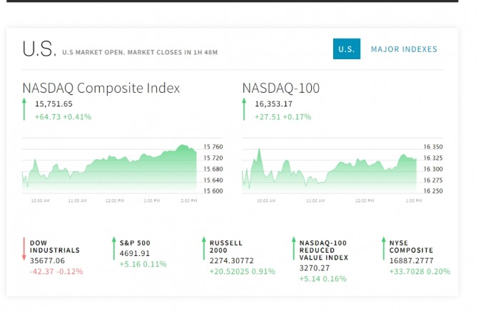 미국 뉴욕증시는 오미크론 변이에 대한 우려가 크게 줄어든 가운데 혼조양상이다. 뉴욕 증권거래소(NYSE)에서 다우존스30산업평균지수는 소폭 하락하고 있다. 반면 스탠더드앤드푸어스(S&P)500지수와 기술주 중심의 나스닥 지수는 오르고 있다. 뉴욕증시에서는 오미크론에 대해 안도하는 분위기다. 주말에 발표되는 소비자물가지수(CPI)와 연방준비제도(Fed)의 다음 주 연방공개시장위원회(FOMC) 정례회의에 더 큰 이목이 쏠려있다.