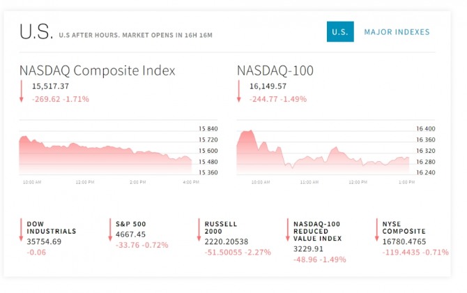 아메리칸항공의 주가는 보잉의 737 드림라이너 인도 지연으로 인해 0.4% 하락했고, 보잉의 주가도 1.6% 하락했다. 게임스톱은 손실이 확대됐다는 소식에 10% 이상 하락했다. 아마존의 주가는 이탈리아 정부가 시장 지배력 남용을 이유로 13억 달러의 과징금을 부과했다는 소식에 1% 이상 떨어졌다. CVS 헬스는 연간 전망치를 기존 전망치의 상단으로 올리고 자사주 매입 계획을 발표하면서 4% 이상 올랐다. 미국 시카고상품거래소(CME) 페드워치에 따르면 연방기금(FF) 금리 선물 시장은 내년 6월 1회 금리 인상 가능성을 43.1%로 반영했다. 2회 금리 인상 가능성은 28.5%로 반영했다. 내년 5월 1회 이상 금리 인상 가능성도 55.9%를 넘어서며 시장은 내년 첫 금리 인상 시기를 5월로 앞당겼다. 미국 시카고옵션거래소(CBOE)에서 변동성 지수(VIX)는 전장보다 1.68포인트(8.44%) 오른 21.58을 기록했다.