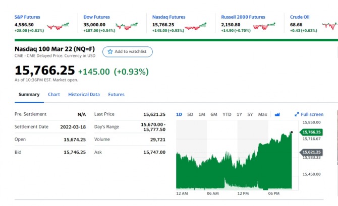 이미지 확대보기21일 뉴욕증시에 따르면 나스닥 다우등 지수 선물이 이 시각 현재 큰 폭의 오름세를 보이고 있다. 비트코인 도지코인등 등 가상화폐도 오름세다. 지수선물의 상승은 정규장 뉴욕증시에서 상승요인으로 작용할 수 있다. 뉴욕증시 지수선물이 부활하면서 코스닥 코스피 등 한국증시와 일본 증시도 회복 조짐을 보이고 있다. <나스닥 다우지수 시세표 참조>