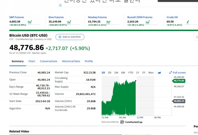 이미지 확대보기21일 뉴욕증시에 따르면 나스닥 다우등 지수 선물이 이 시각 현재 큰 폭의 오름세를 보이고 있다. 비트코인 도지코인등 가상 암호 화폐도 오름세다. 지수선물의 상승은 정규장 뉴욕증시에서 상승요인으로 작용할 수 있다. 뉴욕증시 지수선물이 부활하면서 코스닥 코스피 등 한국증시와 일본 증시에도 생기가 돌고 있다. <나스닥 다우지수 시세표 참조>