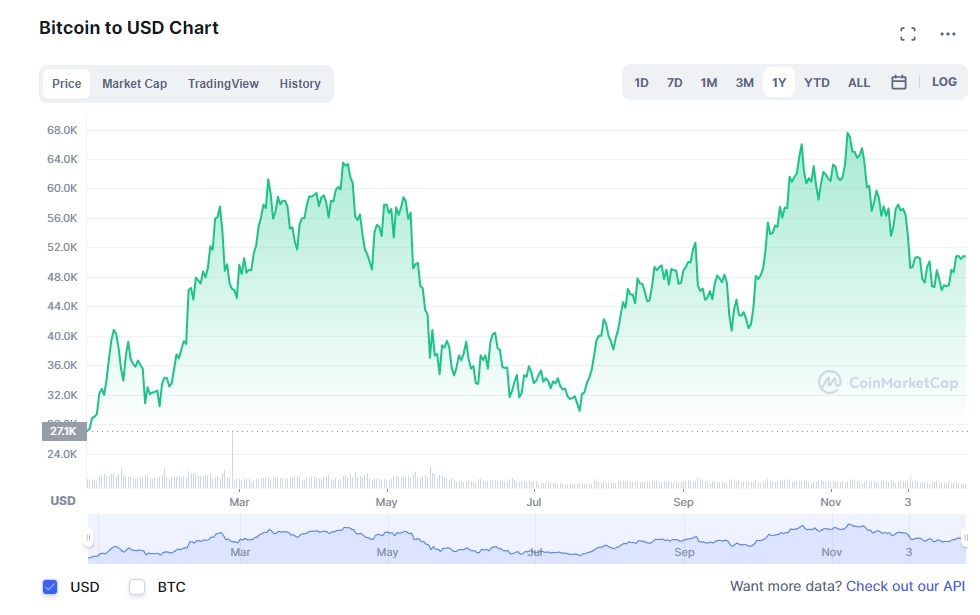 비트코인 가격은 지난 52주 동안 72% 상승했다. 비트코인은 2017년 사상 최고치인 2만달러를 넘어선 후 2020년 12월 말 코인당 약 3만2000달러에 거래됐다. 비트코인은 2021년에 2020년 랠리를 계속했고 지난 4월 6만4000달러를 돌파하면서 사상 최고치에 빠르게 도달했다. 이후 비트코인은 지난 11월 6만9000달러로 새로운 사상 최고치를 경신했다.