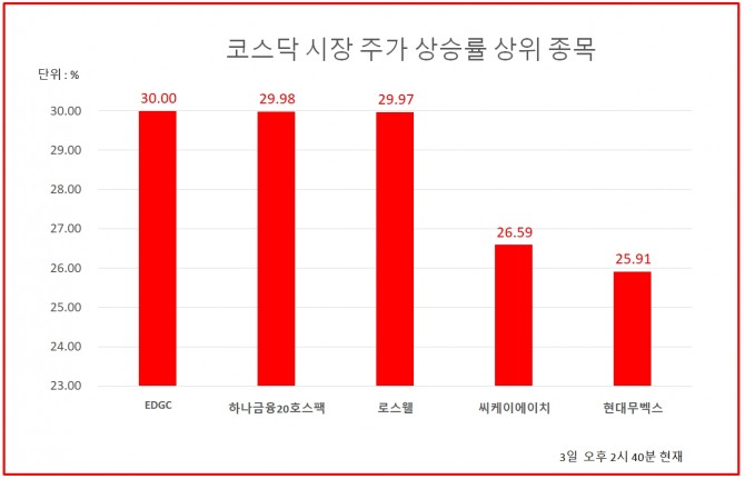 1위 EDGC 4225원 (30%), 2위 하나금융20호스팩 3750원 (29.98%), 3위 로스웰 451원 (29.97%), 4위 씨케이에이치 319원 (26.59%), 5위 현대무벡스 3960원 (25.91%), 6위 로보티즈 30550원 (23.68%), 7위 심텍홀딩스 5870원 (23.45%), 8위 디이엔티 5560원 (20.22%), 9위 핌스 34150원 (18.58%), 10위 헝셩그룹 502원 (18.12%)