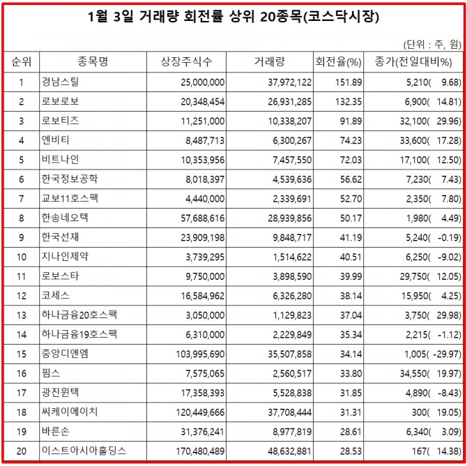3일 주식시장에서 코스닥 종목 거래량 회전률 기준 상위 종목은 다음과 같다.