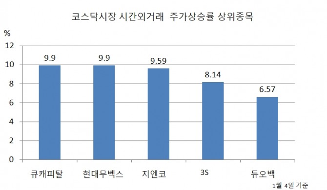 4일 코스닥시장에서 시간외거래 주가상승률 상위 10위까지 종목은 다음과 같다.
