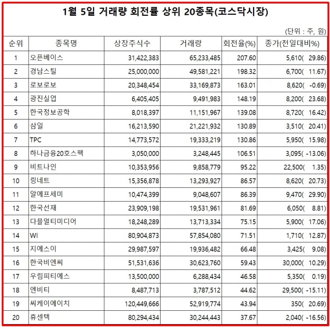 5일 주식시장에서 코스닥 종목 거래량 회전률 기준 상위 종목은 다음과 같다.
