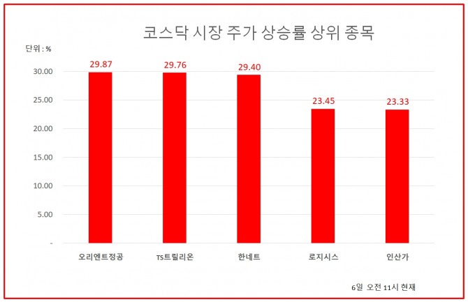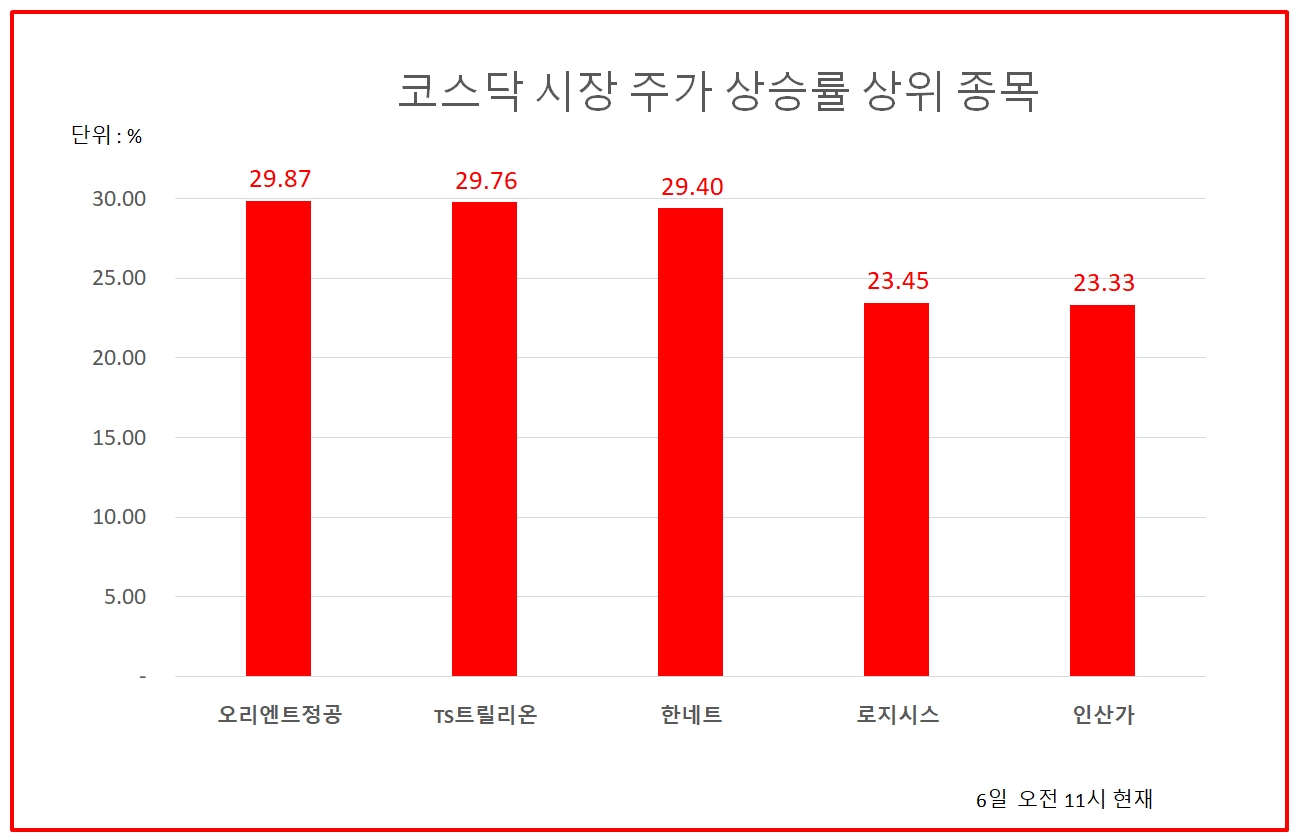 오전 11시 현재 코스닥시장 주가상승률 상위 30개 종목은 다음과 같다.