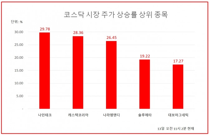 13일 오전 11시 2분 현재 코스닥 상승률 상위 30개 종목은 다음과 같다.