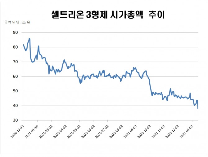 16일 한국거래소에 따르면 셀트리온 3사 시가총액 합계는 지난해 1월 14일 78조6702억 원을 기록했으나 지난 14일 시가총액은 38조72억 원으로 쪼그라 들면서 불과 1년만에 40조 원 이상 증발했다. 올해 들어서도 6조2866억 원 줄어들었다.