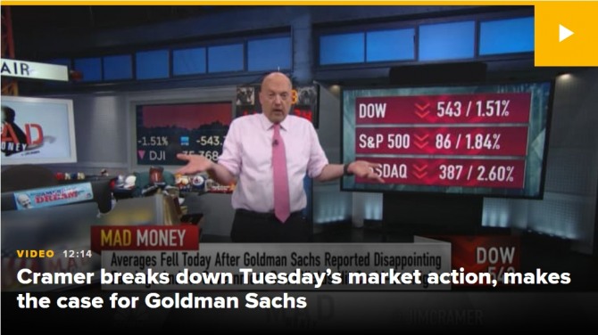 CNBC의 '매드 머니' 진행자 짐 크레이머는 이날 방송에서 골드만삭스의 4분기 실적 부진에 대한 월스트리트의 반응은 과장된 것이라고 말했다.