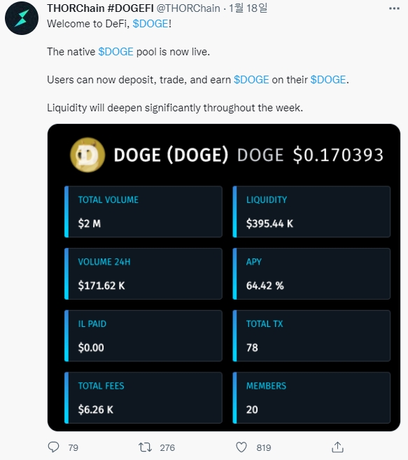 크로스체인 유동성 네트워크 토르체인은 도지코인(DOGE)에 대한 지원을 가능하게 하여 인기 있는 밈코인에 새로운 탈중앙화 금융(DeFi) 기능 제품군을 제공한다.