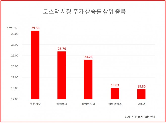 푸른기술 이외에도 에너토크와 피에이치씨가 20%대 상승률을 기록하며 코스닥시장 주가 상승률 상위 종목에 이름을 올렸다.