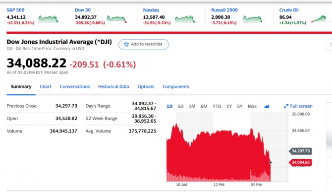 이미지 확대보기27일 뉴욕증시에 따르면 FOMC 정책성명서 발표 때 상승세를 보이던 나스닥 다우지수 등이 갑자기 하락 반전하고 있다. 제롬파월 연준의장이 기자회견에서 테이퍼링 종료를 2월로 앞 당기겠다고 밝히면서 대차대조표 양적 축소 가능성까지 언급하는 등 매파적 정책을 시사하면서 뉴욕증시가 하락 반전하고 있다.