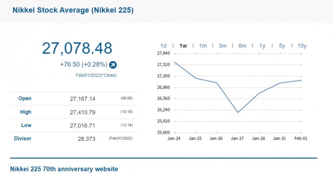 하루전인 1월 31일에는일본 도쿄증시에서 닛케이225지수(닛케이평균주가)는 전 거래일 대비 284.64포인트(1.07)% 상승하며 2만7001.98에 장을 마감했다. 닛케이 지수가 종가 기준으로 2만7000선을 회복한 것은 3거래일 만에 처음이다. JPX 닛케이 인덱스 400지수는 158.99포인트, 0.94% 오른 1만 7087.09에 거래를 마쳤다. 토픽스(TOPIX)지수는 19.04포인트, 1.01% 상승한 1895.93에 시장을 마쳤다.