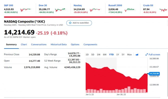 지난 1월 중 달 S&P500지수는 연방준비제도(연준·Fed)의 긴축 우려에 5% 이상 하락해 2020년 3월 이후 최악의 한 달을 보냈다. S&P500지수는 설날 연휴 기간중 수는 지난 2거래일간 4.4% 올라 반등을 모색하고 있다. 나스닥지수는 올들어 10%이상 폭락하면서 이른바 조정국면에 들어갔으나 설말연휴 기간 중 크게 오르면서 조정국면에서 벗어났다. 뉴욕증시에서는 마감 후 구글의 모기업 알파벳과 제너럴모터스, 스타벅스, AMD, 페이팔 등의 실적이 발표된다. 애플에 이어 호실적을 낼 것으로 뉴욕증시에서는 기댈르 모으고 있다