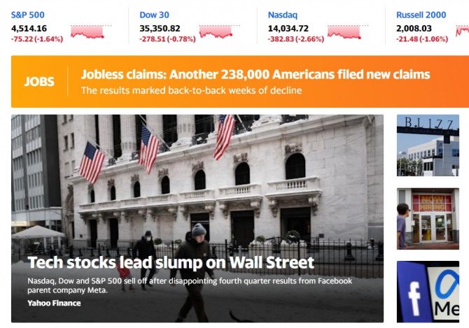 페이스북 메타 플랫폼스는 2021년 4분기 주당순이익이 3.67달러를 기록했다고 발표했다. 뉴욕증시의 예상치 3.84달러를 밑도는 수준이다. 페이스북 분기 매출은 336억7천만 달러로 예상치인 334억 달러를 웃돌았으나 1분기 매출 예상치 즉 가이던스는 시장의 예상치를 크게 밑돌았다. 메타는 올 1분기 매출이 270억~290억 달러에 달할 것으로 예상했다. 뉴욕증시 예상치 301억5천만 달러를 밑도는 수준이다. 그 영향으로 메타의 주가는 25% 이상 하락했다. 스냅과 트위터 주가도 하락 중이다. 스포티파이 주가도 1분기 사용자 수 증가 전망치에 대한 실망으로 폭락하고 있다. 아마존의 주가도 하락 중이다.