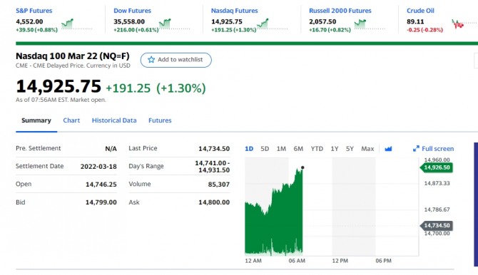 이미지 확대보기앞서 한국시간 9일 아침에 끝난 뉴욕 증권거래소(NYSE)에서 다우존스30산업평균지수는 371.65포인트(1.06%) 오른 35,462.78로 마쳤다. 스탠더드앤드푸어스(S&P)500지수는 37.67포인트(0.84%) 상승한 4,521.54에, 기술주 중심의 나스닥 지수는 178.79포인트(1.28%) 뛴 14,194.46으로 마감했다. 이날 S&P500지수와 나스닥 지수는 하락세로 출발했으나 막판에 오르면서 상승 마감했다. 곧 발표되는 소비자물가지수(CPI)가 최대의 변수이다. 뉴욕증시에서는 1월CPI가 전달보다는 0.4% 오르고, 지난해 같은 기간보다는 7.2% 올랐을 것으로 보고 있다.