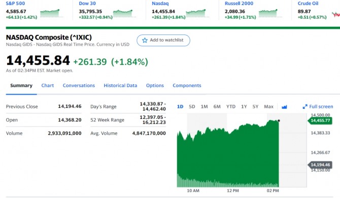 이미지 확대보기미국 뉴욕증시에서 나스닥 다우지수 등이 비교적 큰 폭으로 오르고 있다. 실적호조가 이어지는 데다 우크라이나 사태가 러시아와 EU간에 화해 국면을 맞고 있다는 보도가 뉴욕증시에 랠리가 이어지고 있다. 10년물 국채금리도 다소 안정되고 있다. 비트코인은 5만달러 돌파를 눈앞에 두고 있다.
