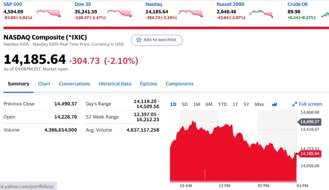 이미지 확대보기11일 뉴욕증시에 따르면 나스닥 지수는 이날 2%이상 밀린 상태에서 마감했다. (뉴욕증시 마감시세 별첨)