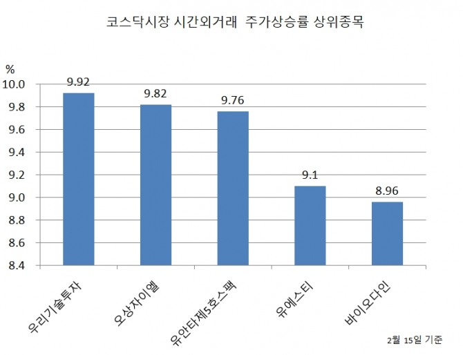 표기 순서는 순위, 종목명, 15일 시간외거래 종가, 시간외거래 주가상승률 순이다.
