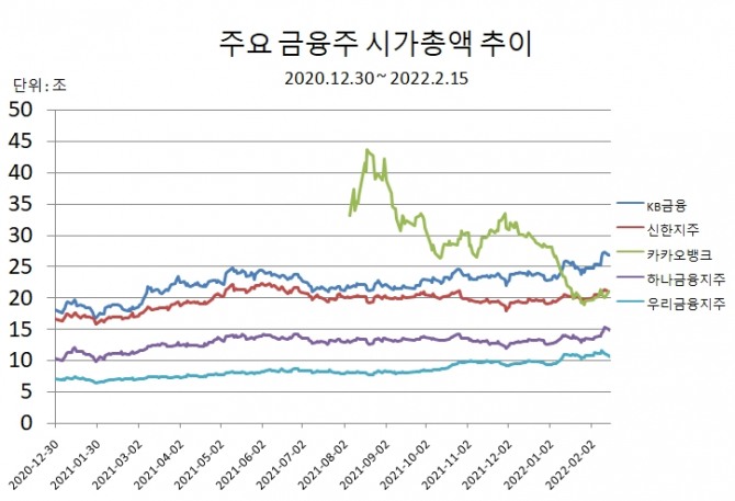 KB금융지주는 올해 1월 카카오뱅크를 제치고 금융주 시가총액 선두에 나섰으며, 신한금융지주도 카카오뱅크와 시가총액 2위 경쟁을 벌이고 있다.