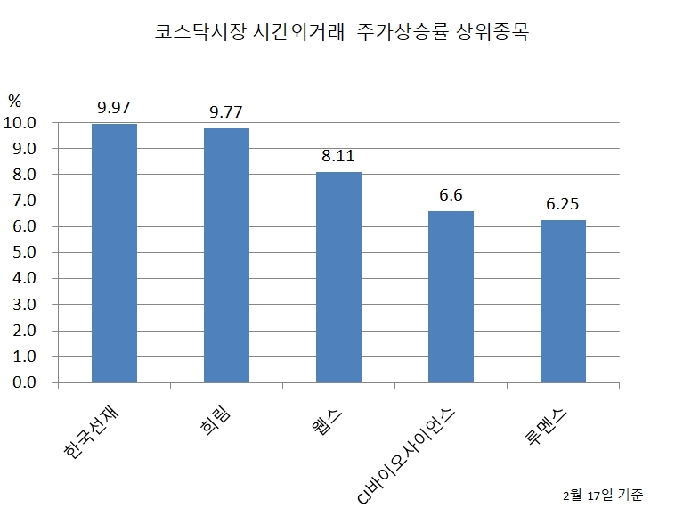 17일 코스닥시장에서 시간외거래 주가상승률 상위 종목은 다음과 같다.