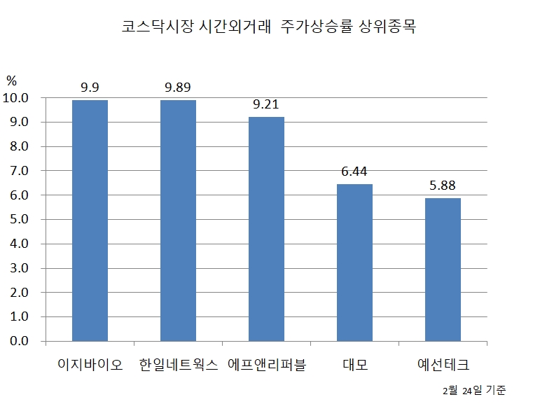 24일 코스닥시장 시간외거래에서 주가상승률 상위종목은 다음과 같다.