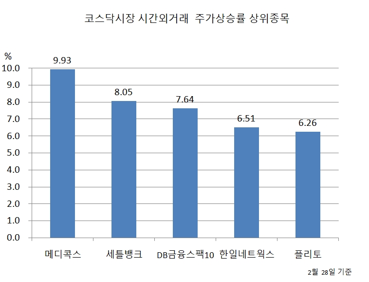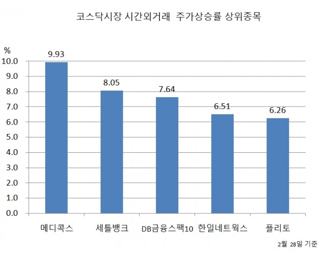 지난달 28일 시간외거래에서 메디콕스 이외에도 세틀뱅크가 8.05% 상승했고, DB금융스팩10호도 7.64% 상승하며 상승률 상위권에 이름을 올렸다.