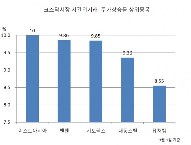 이미지 확대보기3일 한국거래소에 따르면 이스트아시아홀딩스는 전날 마감후 이어진 시간외거래에서 10% 상승해 시간외거래 주가상승률 1위를 기록했다.