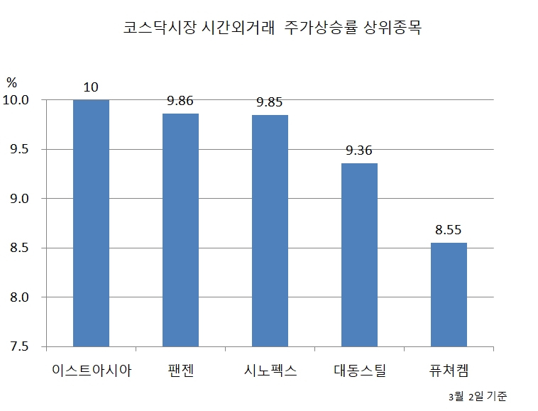 지난 2일 코스닥 시장 시간외거래 주가상승률 상위종목은 다음과 같다.