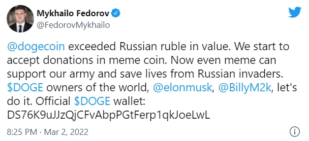 미하일로 페도로프 우크라이나 부총리 겸 디지털 변환부 장관은 2일 아침 트위터에 공식 DOGE 지갑 주소와 함께 개를 주제로 한 암호화폐 기부를 요청했다.