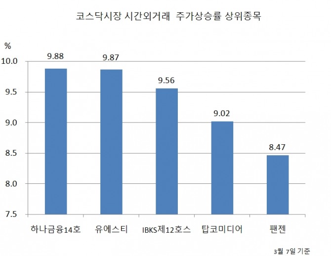 표기 순서는 상승률 순위, 종목명, 7일 시간외 종가, 시간외거래 주가 상승률 순이다.